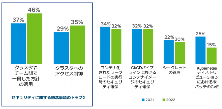 管理するKubernetesのクラスタ数が増え、マルチクラウドへのデプロイが増えたことによって、Kubernetesを運用する上での「セキュリティ上の懸念事項」に変化が生じている(図4)。懸念事項として「クラスタやチーム間で一貫した方針を適用」を挙げた回答者は2021年から2022年にかけて9ポイント増えて46%(1位)になった。「クラスタへのアクセス制御」を挙げた回答者は6%増えて35%(2位)になった。