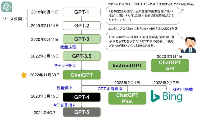 • 正確にはGPT-3.5をベースとしており、その進化版GPT-4もリリースされている