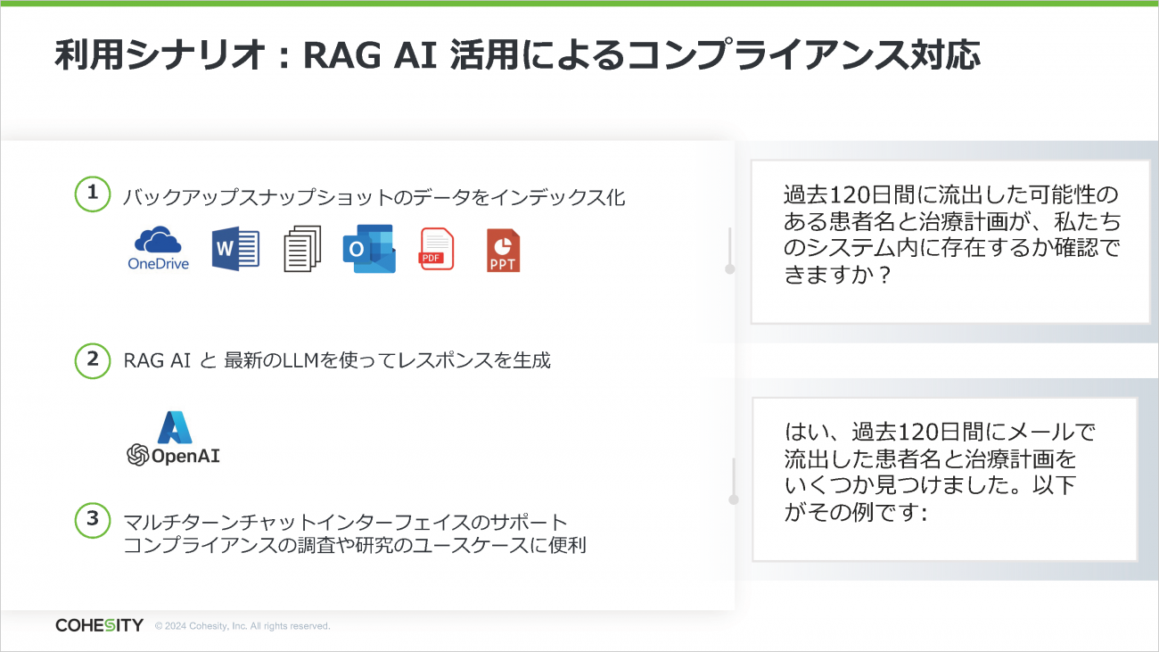 また、Gaiaではユーザーの役割に基づいたアクセス制御、ゼロトラストセキュリティの原則が採用されており、許可されたユーザーとLLMだけが必要なデータにアクセスできる。Gaiaのメリットは「企業内にある質の高いデータを容易に生成AIで利用でき、そのためのRAGの仕組みをCohesityの単一プラットフォームでセキュアに実現できることです」と笹氏。生成AIの企業利用で求められるコンプライアンスとリスクの管理も実現可能だとする。