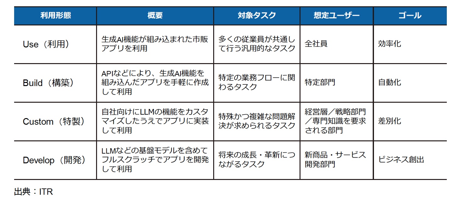 では、生成AIの導入・活用と目的をどのように設定すべきなのか。本レポートでは、企業が生成AIの利用形態を、「Use(利用)」「Build(構築)」「Custom(特製)」「Develop(開発)」という4つのアプローチを段階的に定義している。