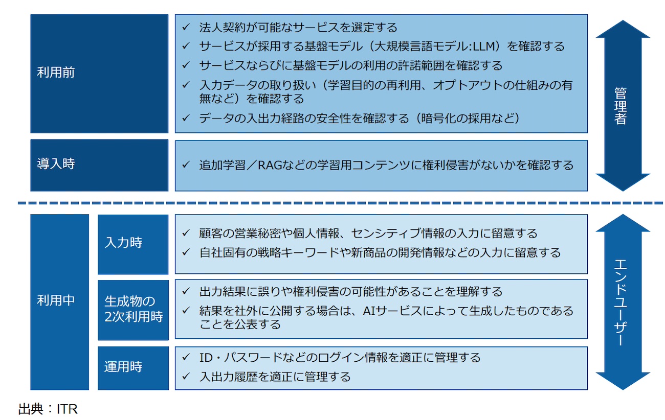 生成AIサービスは、一般的にプロンプトを入力することで情報やコンテンツが成果物として出力される。また、RAGやファインチューニングなど、自社データを活用したカスタマイズも行われることがある。したがって、情報漏洩に関する懸念は広く共有されているが、「機密性」に関わるもの以外にも想定すべきリスクが存在する。生成AIの活用に伴うリスクに対応するためには、組織として包括的なAIガバナンス体制の構築が不可欠である。ITRのレポートでは、生成AIのガイドライン策定に関する具体的なチェックリストが示されている。