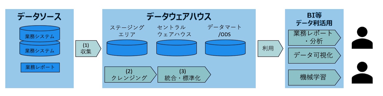 - 複数データソースからのデータを統合し、標準的な形式へ変換する[ 図中(3) 統合・標準化 ]