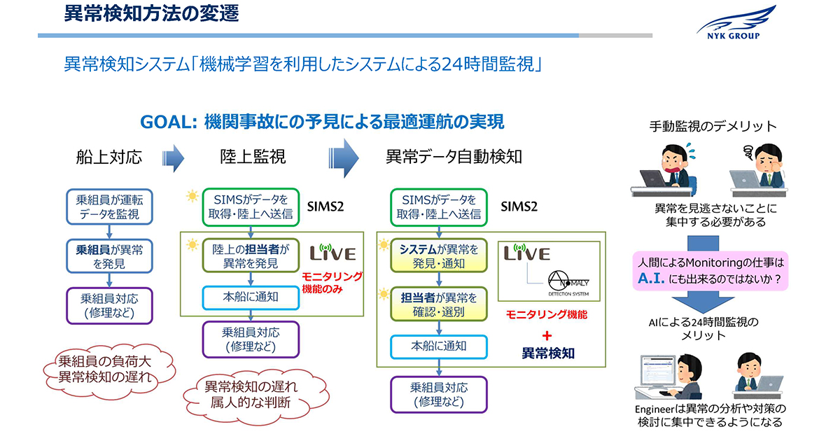以前は船が一度出帆してしまえば、以降は船の上だけで運航は完結するしかなかった。運航中に何らか問題があっても、修理は乗組員によって行うしかなく、陸上では事後に報告を聞くだけだった。今は、それがかなり様変わりした。運航している船舶の状況を陸上から多くの目で監視し、大きなトラブルに発展する前の対処を可能にしている。とはいえ監視する目が増えれば、監視そのものを行う人的な負荷は高くなる。そのために異常の検知を自動化するためのアプリケーションを構築している。