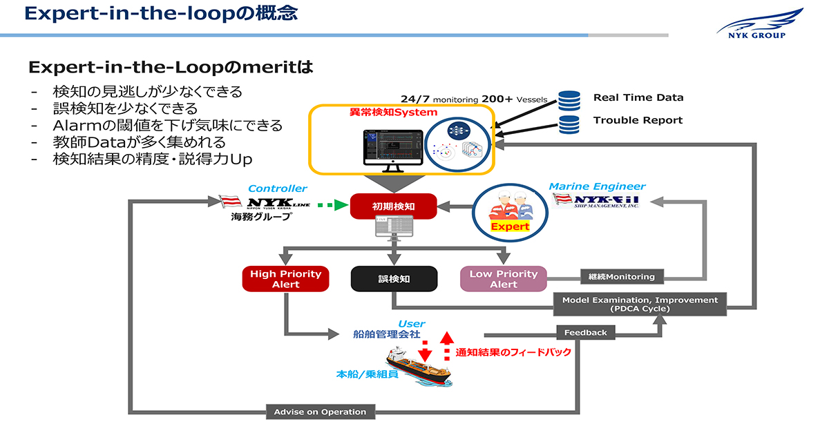 「異常検知システムが出す結果が100%正しいわけではありません。若干閾値を緩めて多めに検知するようにして、あとは人がフィルターをかけます。それは、モニタリングをしている海技者(エキスパート)の仕事としてやってもらいます」と山田氏。