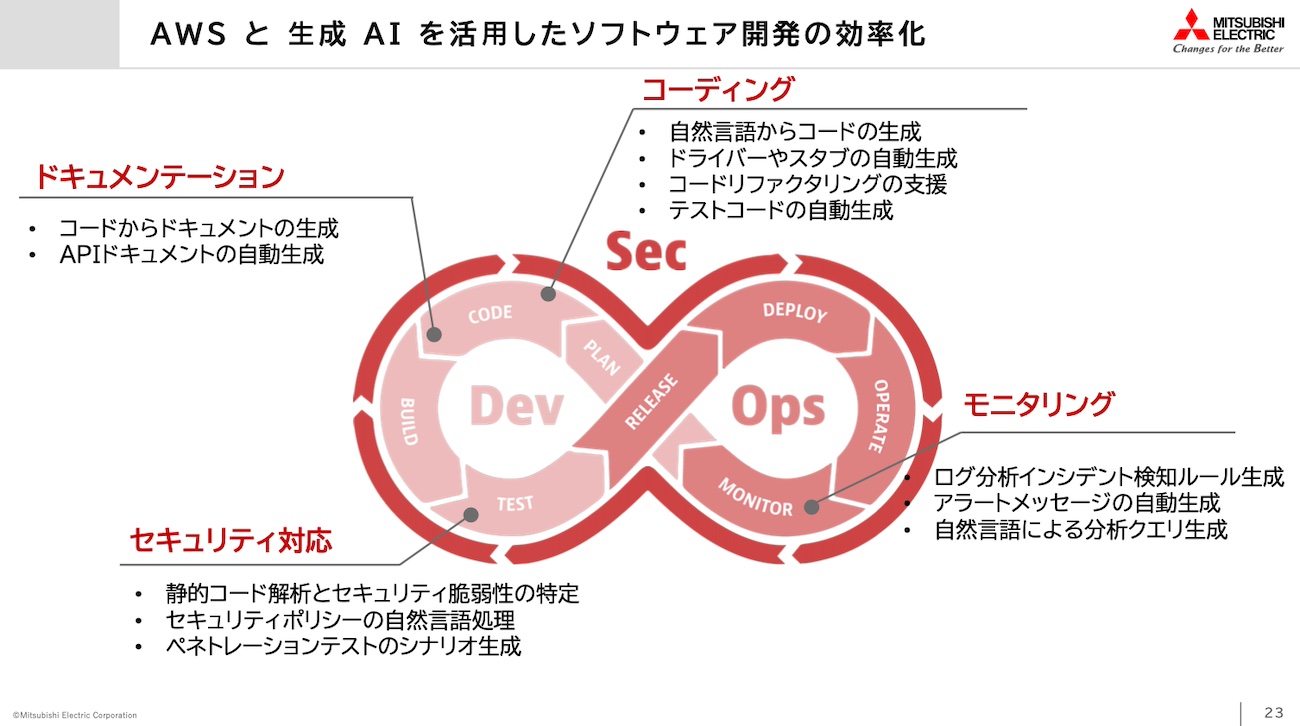 DevSecOpsのプロセスにおける生成AIのユースケース 出典:三菱電機 [画像クリックで拡大]