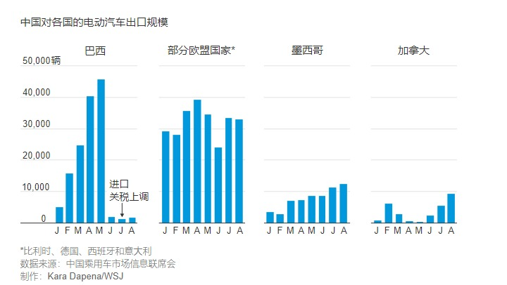 巴西就是一个例子,由于关税上调,该国从中国进口的电动汽车数量急剧下降。欧盟对中国电动汽车的进口量也停止增长,而在墨西哥和加拿大等其他一些市场,来自中国的电动汽车进口量仍在增长。